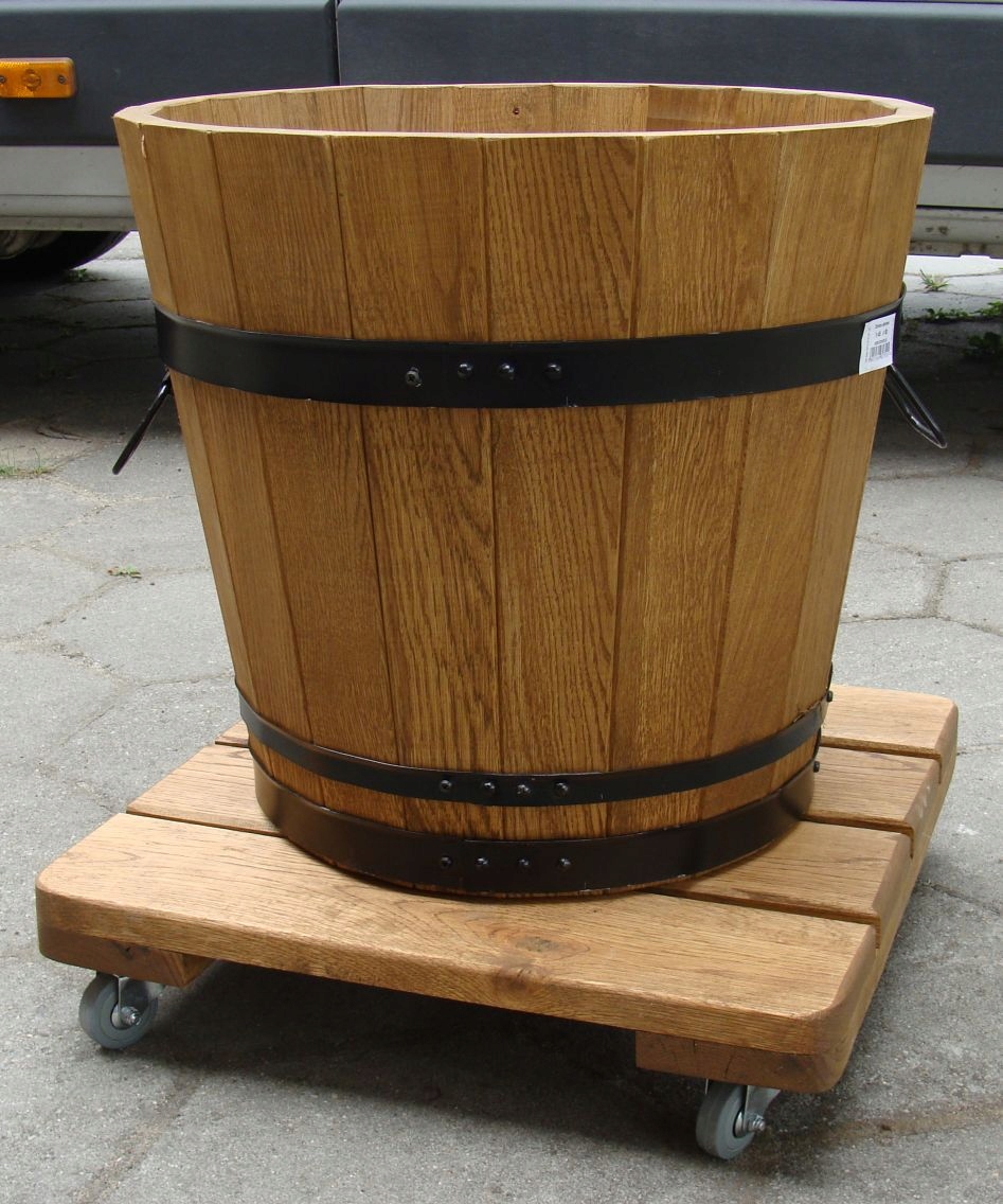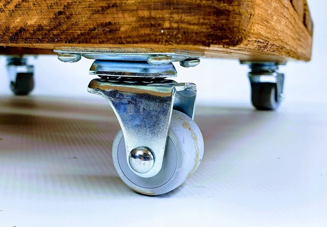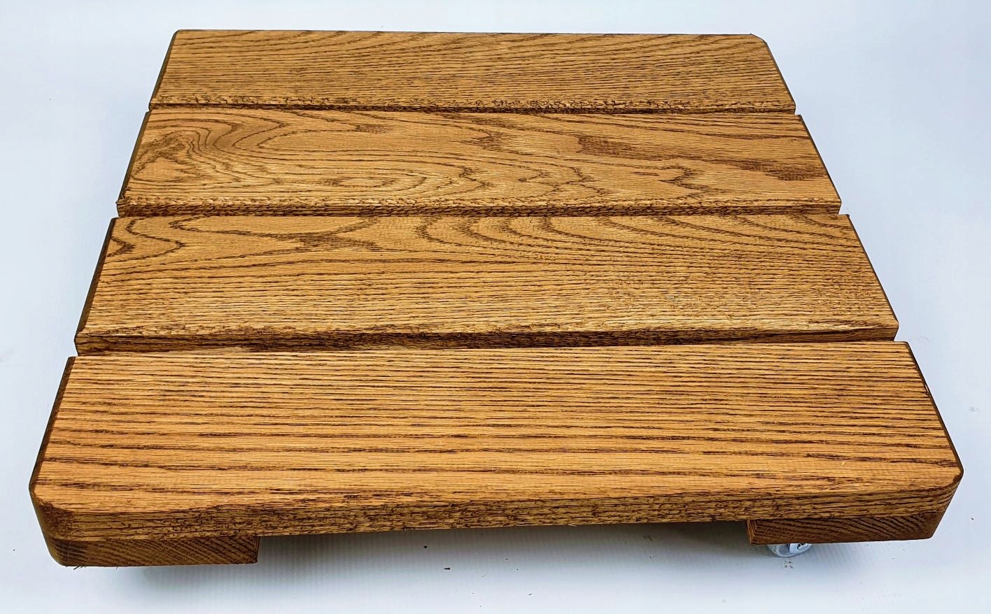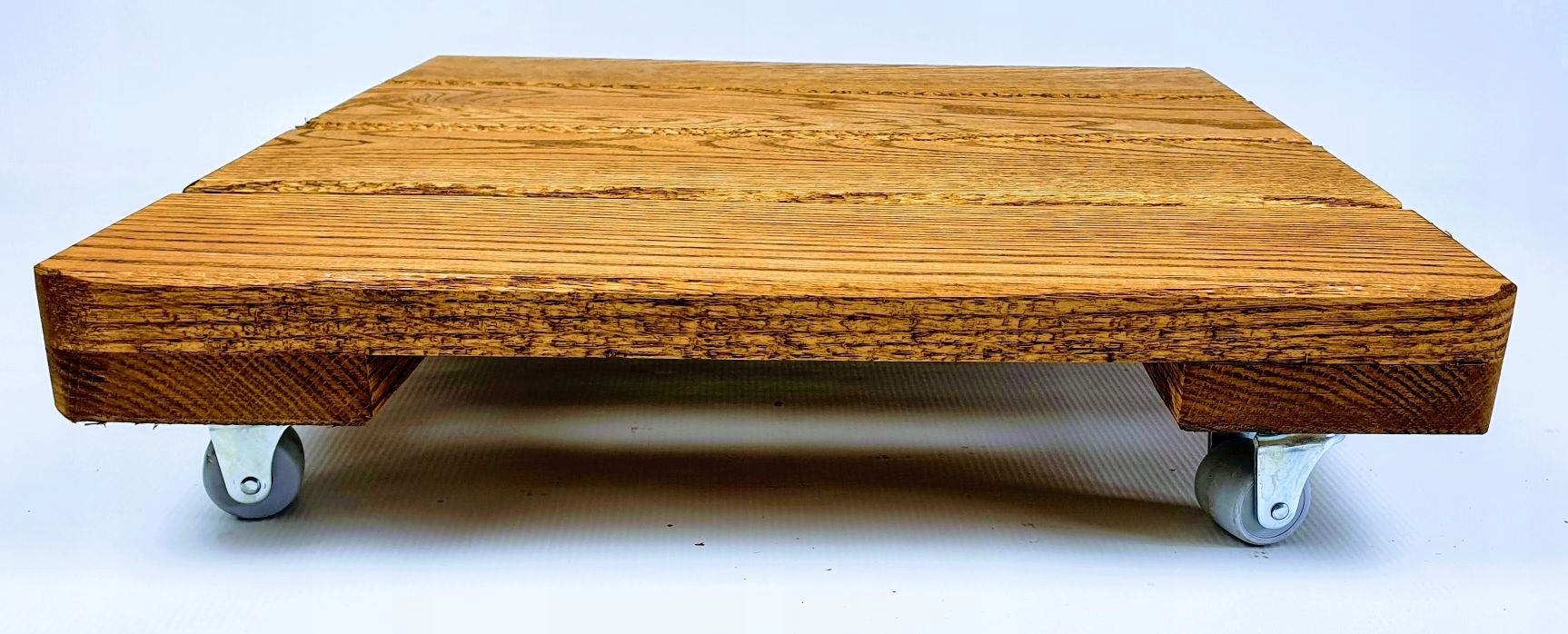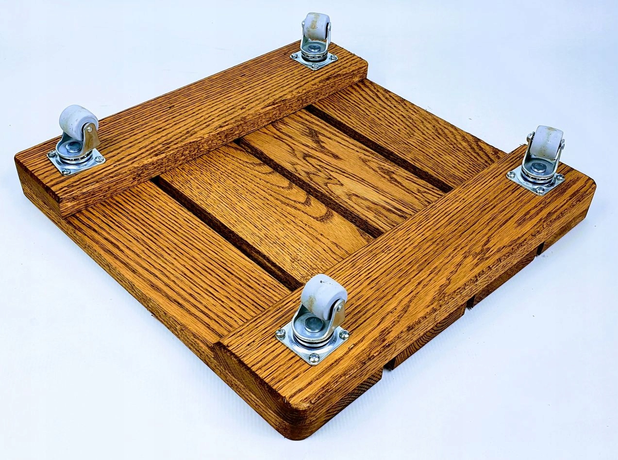 Solidna podstawka pod donicę wykonana z drewna dębowego najwyższej jakości na 4 łożyskowanych kółkach (polskiego producenta), okładzina z twardej gumy nie brudząca
