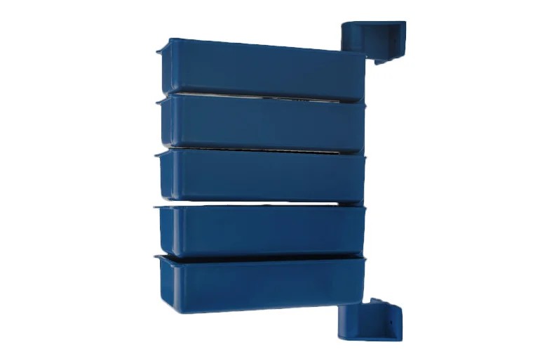 Zestaw składa się z 3 zawieszonych na wspólnej osi. Każdy z nich posiada specjalne uchwyty na rogach, które umożliwiają łatwe obracanie i wysuwanie wybranego pojemnika – bez potrzeby demontażu całego zestawu.