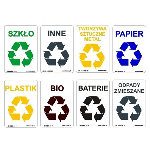 Dostępne są również inne rozmiary koszy z serii EKO. Istnieje możliwość oznakowania pojemników za pomocą naklejek informacyjnych (np. do segregacji odpadów).