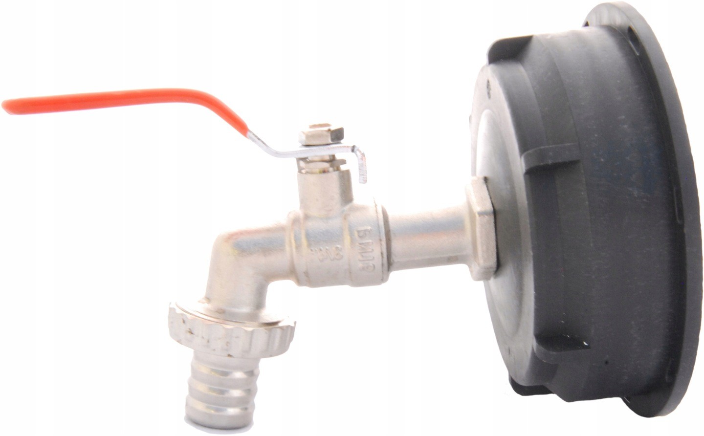 Nowa nakrętka plastikowa z grubym gwintem DIN100, pasująca do zbiorników IBC (np. Mauser) o pojemności 600L i 1000L. W zestawie znajduje się również metalowy zawór czerpalny o średnicy 3/4 cala