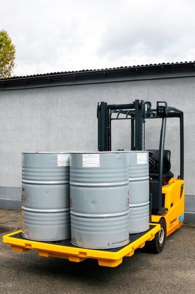 Niskoprofilowa paleta wychwytowa z kratownicą, pod cztery beczki lub jeden kontener IBC
